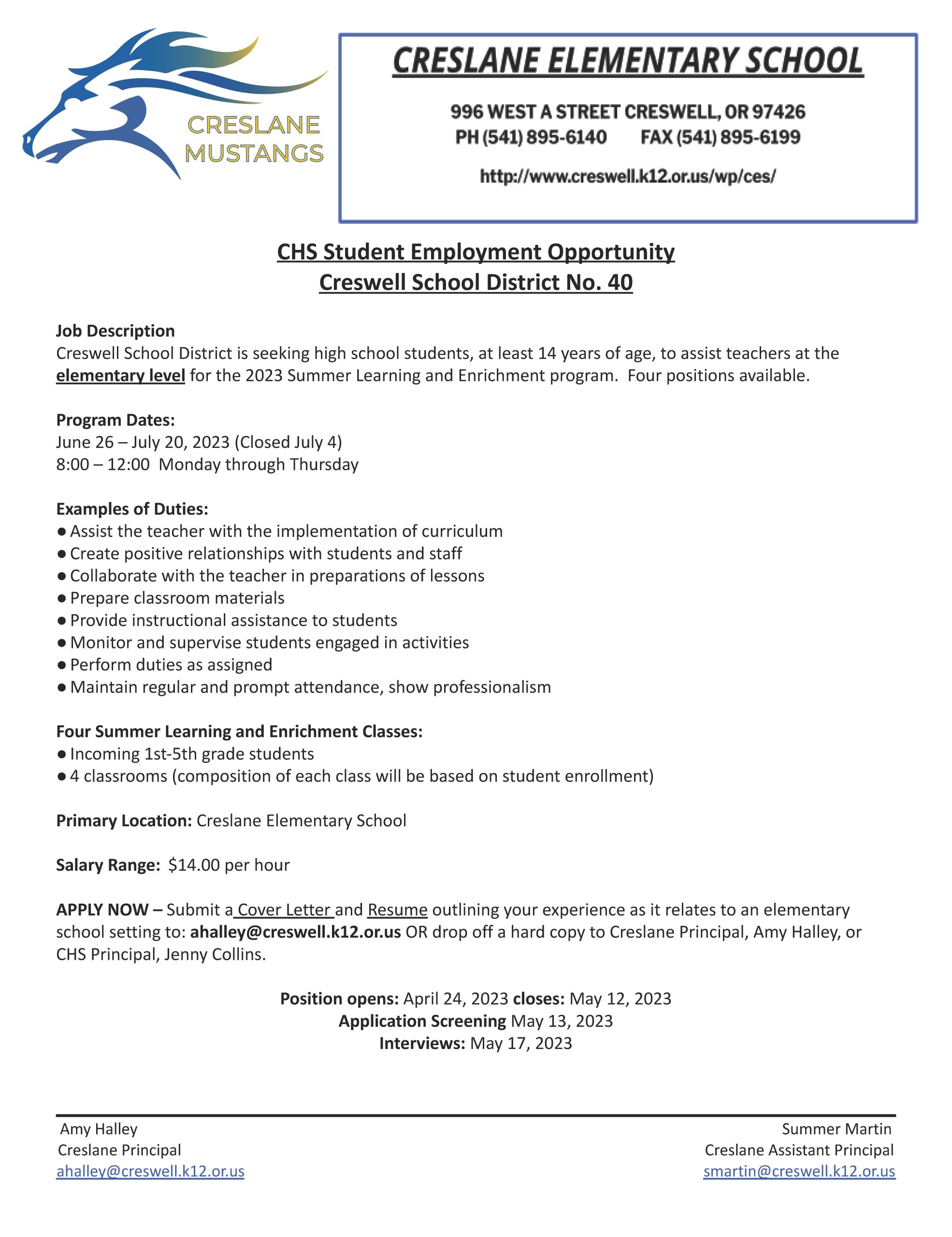 CHS Students: Summer Job Opportunity!